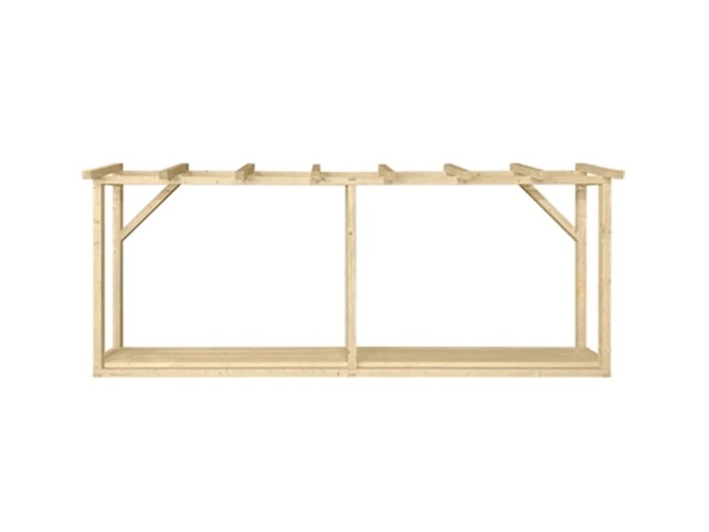 Dřevník ke zdi o rozměrech 690×2 130×5 000 mm je určen pro skladování velkého množství palivového dřeva přímo u domu, chaty nebo chalupy. Díky masivní konstrukci z kvalitního dřeva poskytuje vysokou stabilitu a odolnost proti povětrnostním vlivům. Otevřená čelní strana umožňuje přirozené odvětrání, které podporuje správné vysychání dřeva, a šikmá střecha zajišťuje ochranu proti dešti a sněhu.