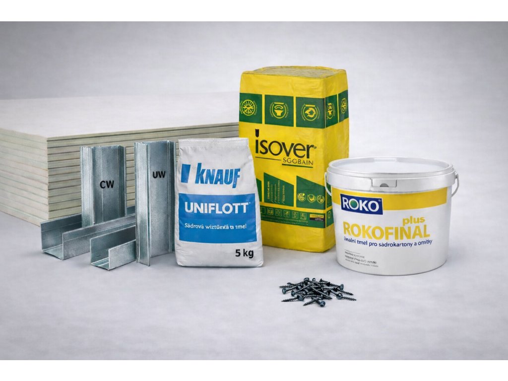 Komplet obsahuje kompletní skladbu materiálu pro zavěšený sádrokartonový podhled s tepelnou izolací. Sestava je navržena jako orientační materiálová kalkulace pro realizaci podhledu o ploše cca 10 m² při běžné výšce zavěšení.