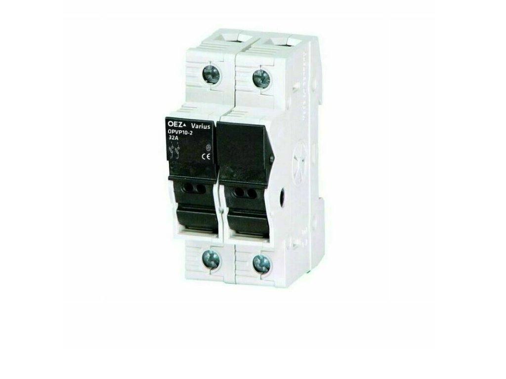 Pro válcové pojistkové vložky PV10, pro obvody fotovoltaických systémů, jmenovité napětí DC 1 000 V, jmenovitý proud 30 A, 2pól, velikost pojistky 10×38 mm.