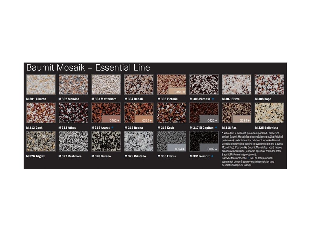Omítka dekorativní Baumit MosaikTop Essential Line je vysoce kvalitní mozaiková omítka vhodná zejména pro soklové části fasád a dekorativní prvky. Poskytuje vysokou mechanickou odolnost a esteticky atraktivní vzhled, který vydrží dlouhodobé zatížení.
