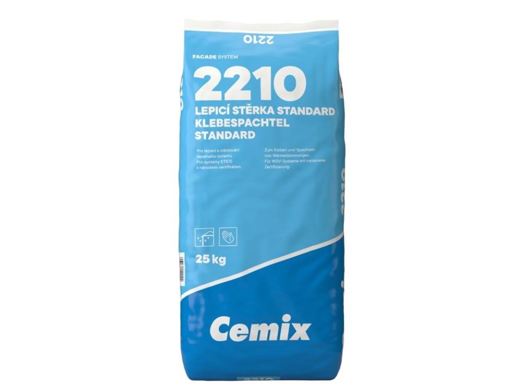Lepicí a stěrková hmota Cemix 2210 Standard je určena pro ruční i strojní zpracování v interiéru i exteriéru. Je vhodná zejména pro vnější tepelněizolační systémy (ETICS) a pro vyrovnání nerovností zdiva nebo omítek při současném vkládání výztužné tkaniny.