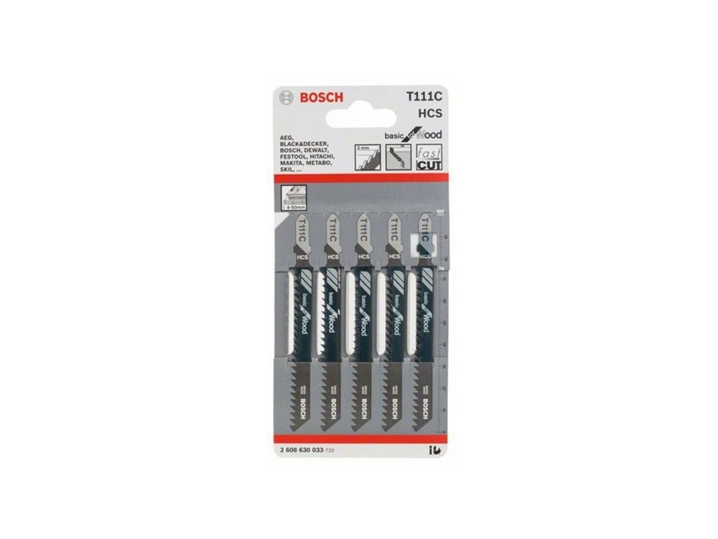 Sada Bosch T 111 C Basic for Wood obsahuje pět pilových plátků určených pro přímočaré pily s upnutím T-stopka. Plátky jsou ideální pro rychlé a hrubé řezy do měkkého dřeva, OSB desek, laťovek a dřevovláknitých materiálů o tloušťce 4–50 mm. Vyrobené z oceli HCS (High Carbon Steel) pro spolehlivý výkon v neabrazivních dřevěných materiálech. Díky frézovaným, rozvedeným zubům poskytují efektivní řez bez speciálních požadavků na kvalitu povrchu.