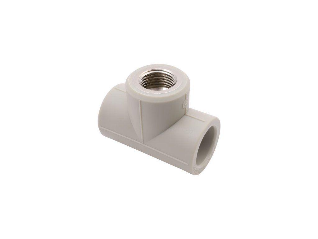 PPR T-kus 20 × 1/2" × 20 s vnitřním kovovým závitem je kombinovaná tvarovka určená pro rozvětvení potrubí s možností napojení závitové armatury. Umožňuje vytvořit odbočku ze systému PPR a zároveň přechod na kovový závit.