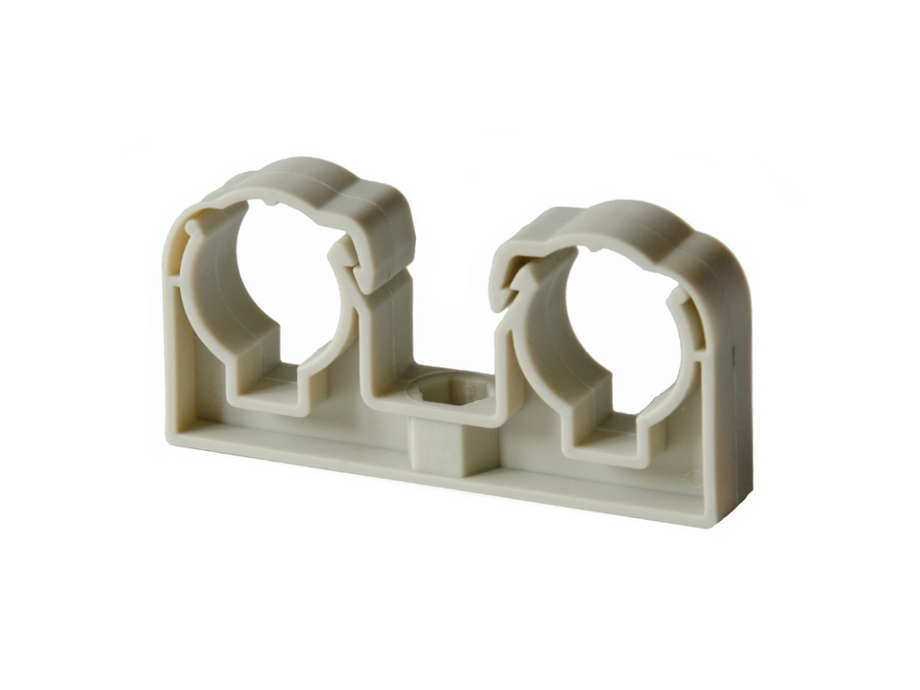 Příchytka s třmenem 20 mm, dvojitá je montážní prvek určený pro pevné uchycení dvou potrubí ke stavební konstrukci. Zajišťuje stabilní vedení trubek a zabraňuje jejich pohybu nebo vibracím.