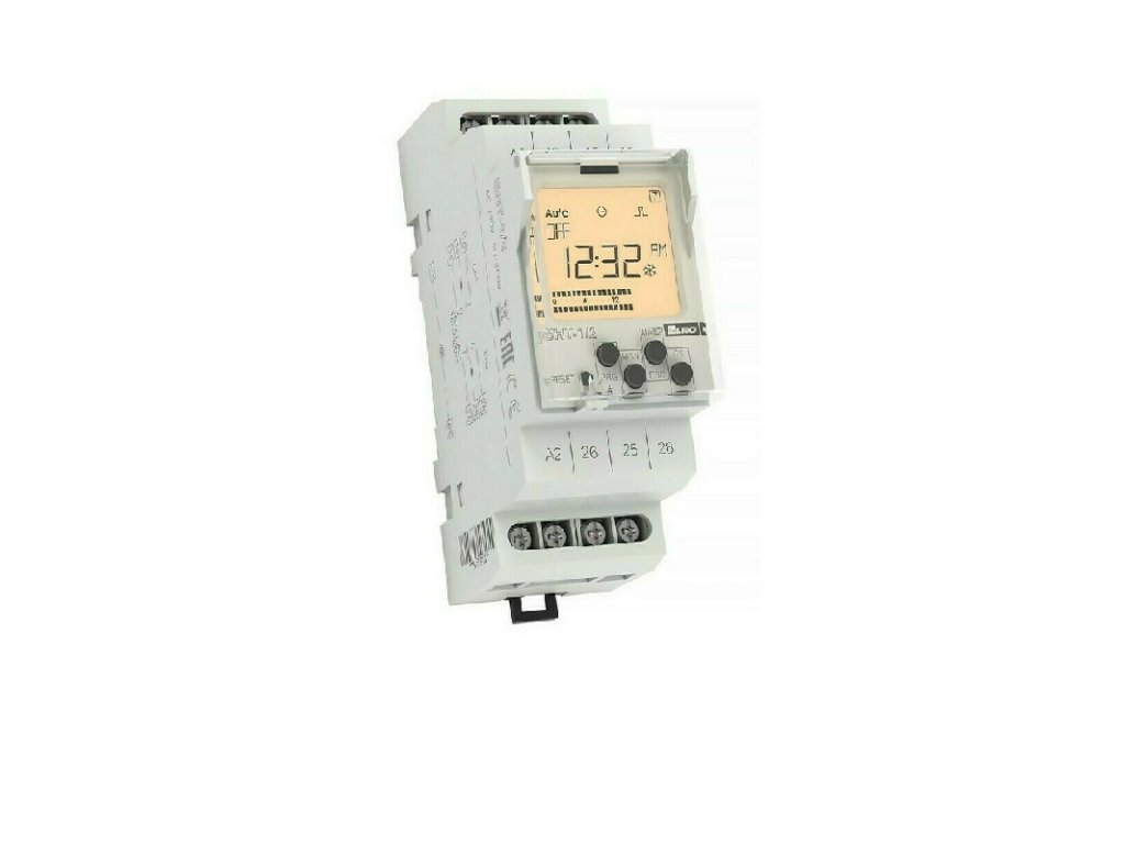 S digitálními spínacími hodinami a fotosenzorem SKS, 1× kontakt přepínaný, jmenovitý proud 8 A, nastavitelná úroveň osvětlení v rozsahu 10–50 000 Lx, napájecí napětí AC 230 V, 2 moduly.