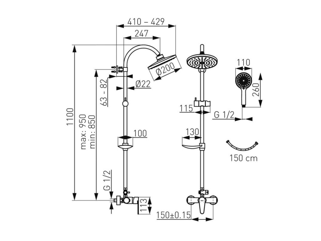 - Komponenty: Hlavová sprcha, ruční sprcha, sprchová tyč