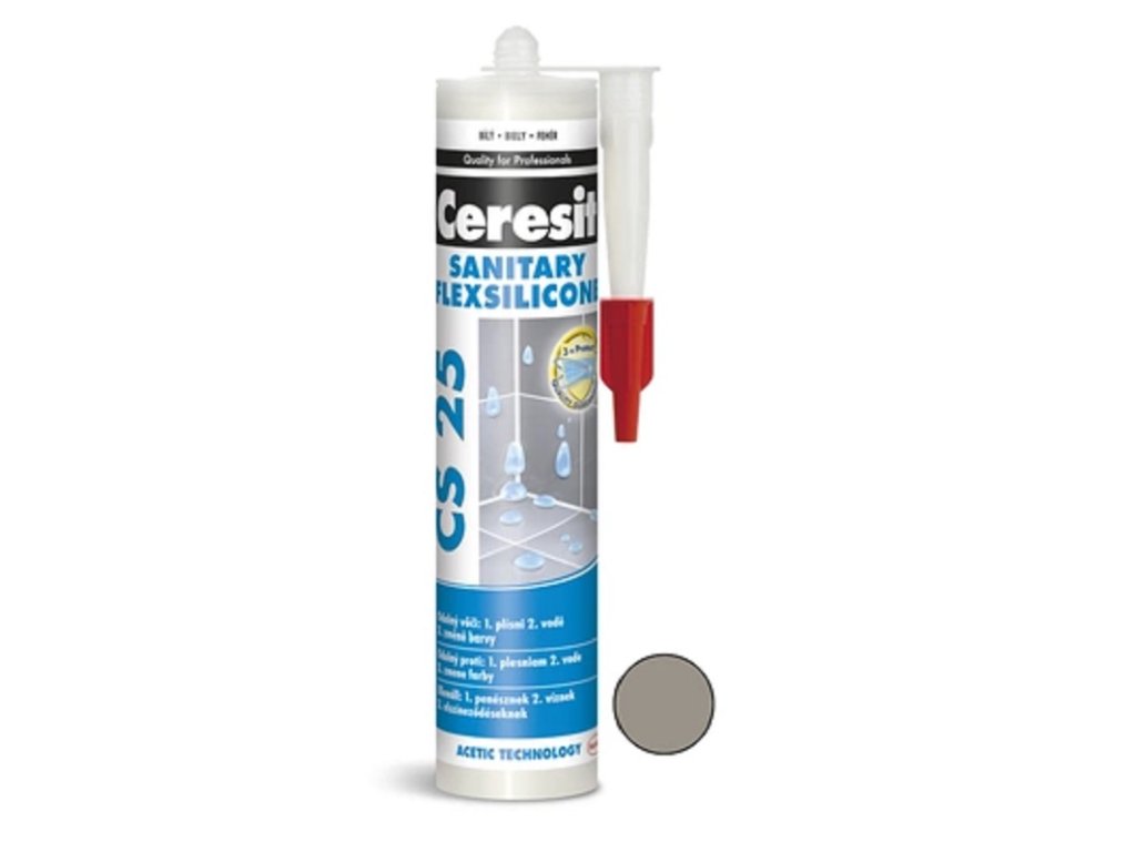 Ceresit CS 25 cementově šedý je jednosložkový silikonový tmel na bázi acetátu, určený pro vyplnění dilatačních a spojovacích spár mezi keramickými obklady a dlažbou v rozích nebo ve styku stěn, podlah a k usazování zařizovacích předmětů v sanitární oblasti. Díky své trvalé elasticitě a odolnosti proti vodě je vhodný do oblastí trvale zatížených vlhkostí, jako jsou kuchyně, sprchy, koupelny, toalety, balkóny a terasy.