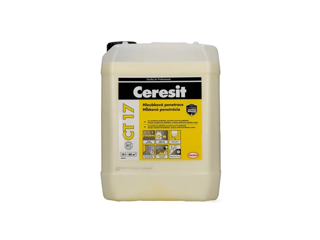 Ceresit CT 17 je hloubkový penetrační nátěr určený ke zpevnění a sjednocení nasákavosti podkladů před pokládkou keramických obkladů a dlažby, vyrovnáváním podlah, stěrkováním, malováním či lepením izolačních desek. Zvyšuje pevnost podkladu, zabraňuje nadměrnému vsakování pojiv a zlepšuje přilnavost dalších vrstev.